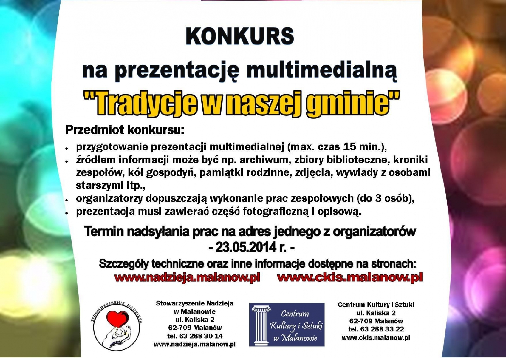 Konkurs skierowany jest do młodzieży gimnazjalnej i ponadgnimnazjalnej, a polega na wykonaniu prezentacji multimedialnej promującej tradycje Gminy Malanów.